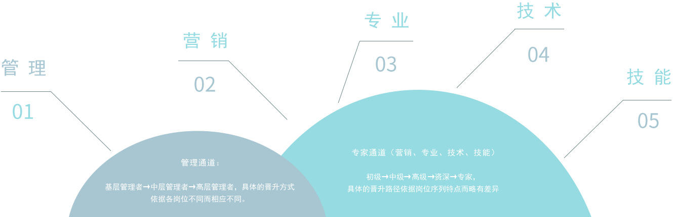 职业发展路径包括管理、营销、专业、技术、技能五个通道路径,可根据自身职业发展规划选择在相应路径上不断成长发展,也可在成长过程中,结合自身意愿,通过自身努力,跨路径成长