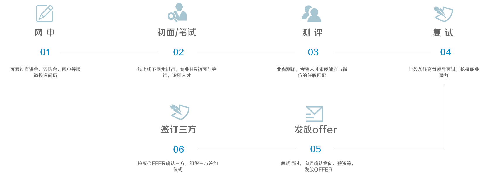 简历投递(网申)>初面/笔试>测评>复试>发放offer>签订三方